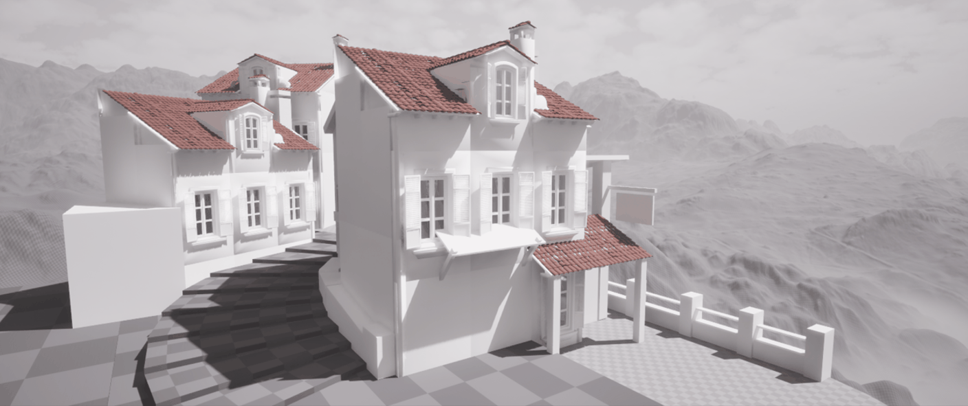 Produce a videogame appropriate environment scene taking influence from Italian/ Mediterranean styled architecture within Unreal Engine: